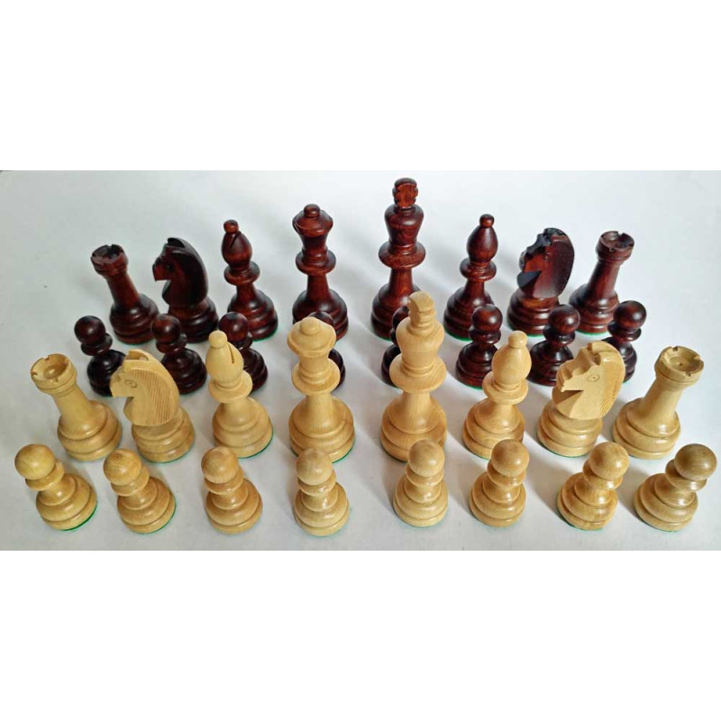 Set de pions d'échecs assez proches des "Chavet" en bois massif de Charme, base plombée et feutrine, belle qualité de fabrication. Roi hauteur 85 mm