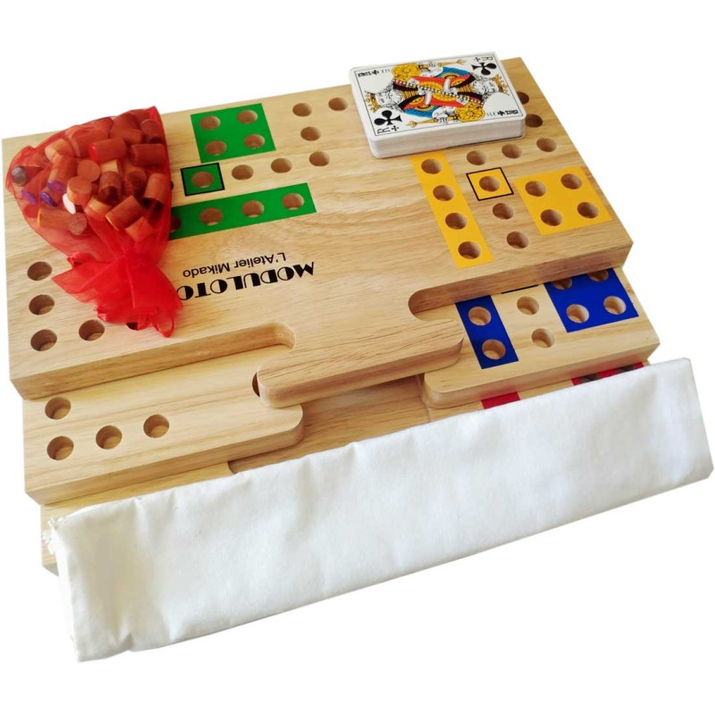 Bois hévéa massif, 3 plateaux connectables pour jouer de 2 à 6 joueurs.